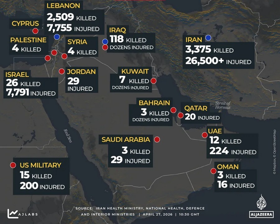 Der katarische Sender Al Jazeera veröffentlicht zu Wochenbeginn die Auswertung der Zahlen zu Toten und Verletzten in der Kriegsregion seit dem 28. Februar, dem Beginn des provozierten US-israelischen Krieges.
